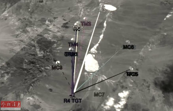高空无人机传回的实时监控画面,其中标有“R4 TGT”的为载有B61-12的F-15E战机,其余均为地面观测点。