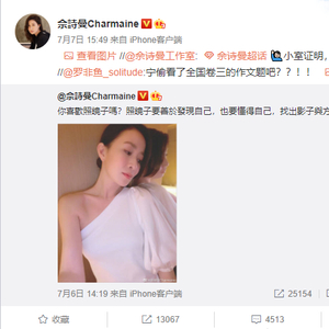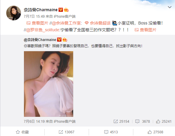 7月7日,高考第一天。有网友发现,佘诗曼前一天的一条微博自拍文案,竟然和全国高考III券作文题惊人相似。在微博发文惊讶直呼:“偷看了全国卷三的作文题吧?!”