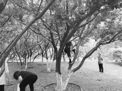 到了傍晚,来龙潭公园跑步、遛弯儿的市民也多了起来。在靠近北1门附近的一片小树林,一株株杏树枝叶繁茂,泛黄的果实挂满枝头。一名男子爬到树上,左手扶着树干,右手不停地晃动杏树,让熟透的杏子快速落地,下面的女士赶紧弯下腰捡拾。记者看到,这位女士手上提着一个塑料袋,已经捡了满满一袋杏。