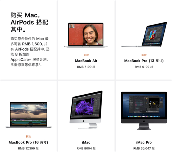 在苹果官网显示,购买MacBook、MacBook Pro(13或16寸款)、iMac或iMac Pro;iPad Air或iPad Pro也包含其中,如果加价,这幅耳机还可以升级成AirPods Pro主动降噪耳机,同时AppleCare+额外保修服务也8折优惠。