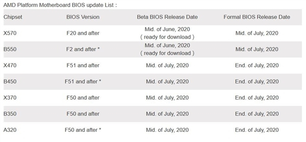 目前,X570/B550主板已经可以下载测试BIOS,中旬转正,其它老主板则是月底转正。