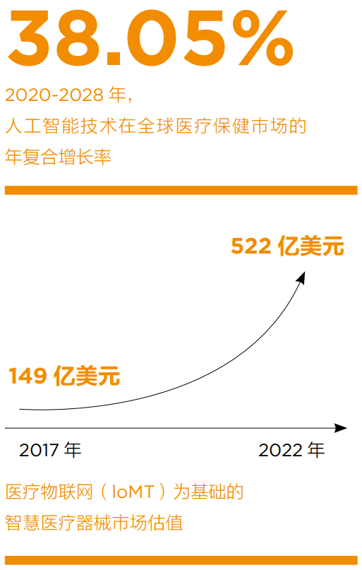 随着 ABCDEI(人工智能 AI、区块链 Blockchain、云计算 Cloud、大数据 Big Data、边缘计算 Edge Computing、物联网 IoT 等数字技术)的快速发展和普及, 智能技术已在合理分配医疗资源,提升健康服务效率和水平时成为全球范围内的不二选择。据统计,2020-2028 年,人工智能技术在全球医疗保健市场的年复合增长率达 38.05%1,主要聚焦临床测试、个性化医疗、实时诊疗系统等;与人工智能同步,未来 5 到 10 年医疗器械智能化成为大势所趋,相关数据显示,2017 年至 2022 年间,以医疗物联网(loMT)为基础的智慧医疗器械市场估值将从也将 149 亿美元增长至 522亿美元 2。在中国,“智慧医疗”一词在 2009 年伴随新医改政策在国内推出,而互联网医疗首诊却直至 2020 年才在新冠肺炎疫情(COVID-19)推动下在政策层面被正式认可。自此以后,医疗数智化便按下了落实全民普及的新“快进键”。