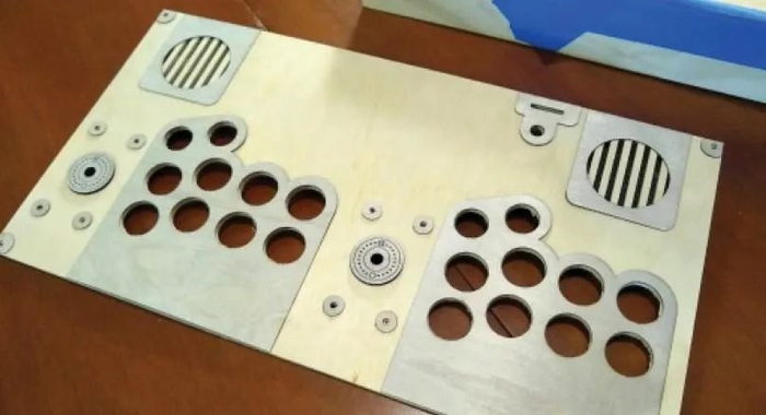 之后,参照在 Illustrator 里设计的布局图,我用激光从桦木胶合板上切割出了装扬声器、按钮和操纵杆等所有需要的孔。还用同样过程切出了之后用来装屏幕的木板。