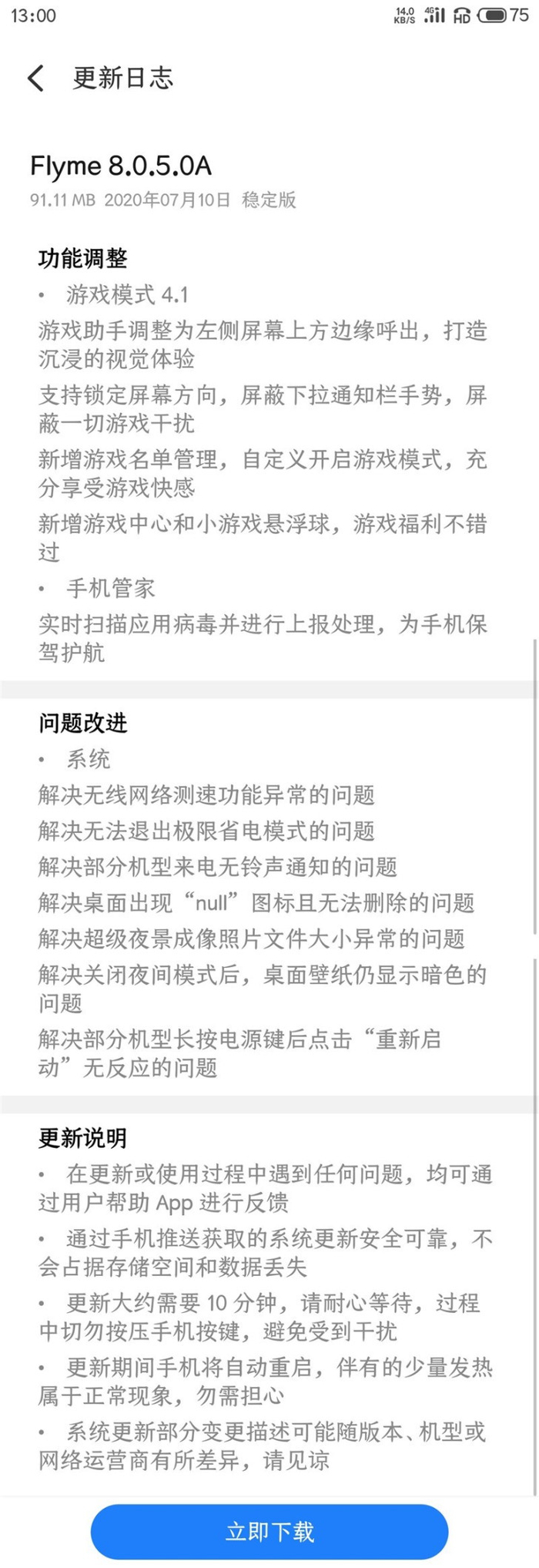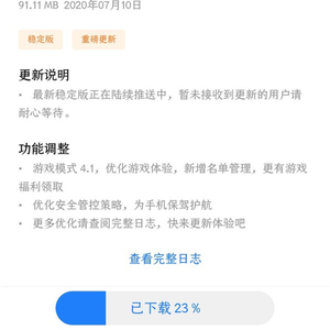 此次推送的更新包大小为 91.11MB,官方将游戏助手调整为左侧屏幕上方边缘呼出、新增游戏名单管理、游戏中心和小游戏悬浮球等功能。此外官方还解决了包括无线网络测速功能异常、无法退出极限省电模式、部分机型来电无铃声通知等 Bug。