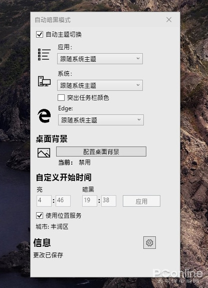 尽管官方已经宣布,将在下个版本中启用全新开始菜单,但Win10主题仍然需要手动切换。“自动暗黑模式”是一款能够根据时间(或定位)自动切换明/暗模式的小工具,支持简体中文,可以实现应用、系统、Edge的主题自动切换。软件同时提供时间、地理位置两种切换规则,用户可根据自己需要进行选择。