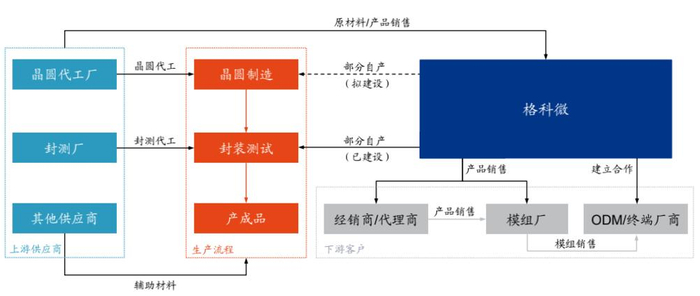 格科微设计生产出 CMOS 传感器后,直销或通过代理商、经销商销售给摄像头模组厂(如舜宇光学、欧菲光等),模组厂将 CMOS 图像传感器与其他电子元件组装成完整的摄像头后,再出售至终端厂商(如三星、小米、OPPO 等)或其代工厂。