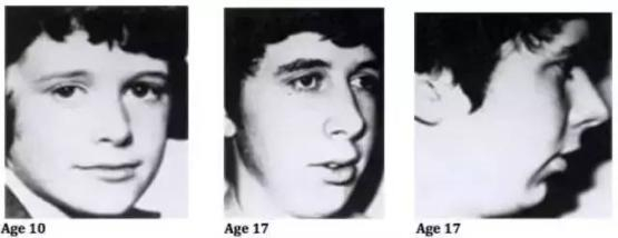 还有下面这个男孩,第一张图是他10岁时,那时开始用口呼吸,随着时间的推移,越长越残:目光呆滞,下巴后缩。