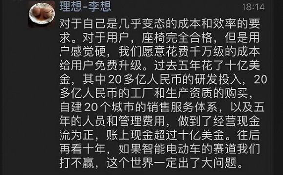 当然,理想发展到今天,不得不服创始人李想的创业家精神,从其朋友圈曝光的评论可以看到,他对造车是认真的。从企业的节衣缩食,到宁愿花大钱做研发,解决用户问题,造车虽然烧钱,但只要烧对了地方,结果是不会辜负的。