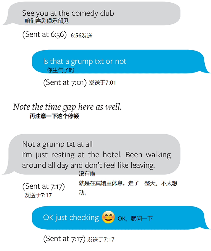 恋爱中的人们的确是能体会到这种短信所引起的焦虑。在我自己的恋爱中,尽管这是一段亲密而稳定的关系,我也经历过一些因为回短信不及时所导致的不愉快。举个例子: