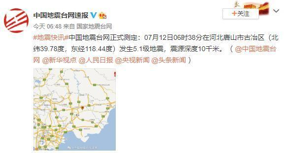 7月12日6时38分,河北唐山古冶区发生(北纬39.78度,东经118.44度)发生5.1级地震,震源深度10公里,京津冀多地区震感明显。同日,唐山市应急管理局回应称,此次地震属于1976年唐山大地震的余震。