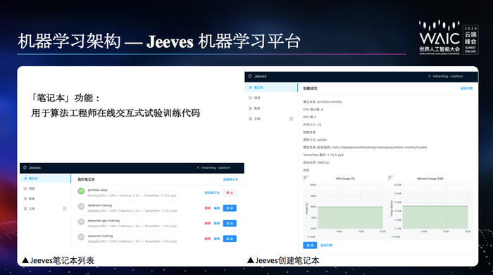 功能层面,Jeeves 主要提供两类功能:一种是「笔记本」,用于在线交互式试验训练代码;另一种是「项目」,用于创建单机或分布式训练。