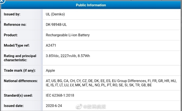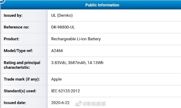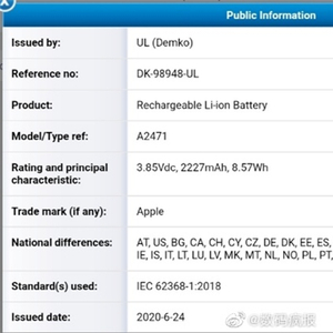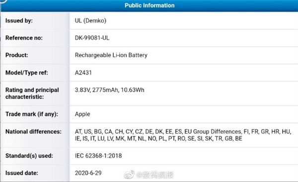 【天极网手机频道】虽然传闻新iPhone的发布可能推迟,但师关于iPhone 12的爆料依然不会停下。数码博主@数码疯报 于7月13日的爆料,三款新iPhone电池通过认证,容量分别为2227mAh、2775mAh、3687mAh。从该博主爆料的内容来看,三款新iPhone电池分别为A2471(2227mAh)、A2431)2775mAh)和A2466(3687mAh),额定容量存在一定程度的缩水。A2466还将采用L型电池,是三款电池中容量最大的一款。