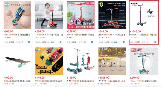 目前市面上的儿童滑板车产品,虽然价格从百元至千元不等,但产品本身并未形成明显区隔。基于电商平台上对“儿童滑板车”这一关键词的搜索信息,不难发现这些儿童滑板车在产品功能和设计上普遍缺乏新意,受众也比较低龄。千篇一律的产品背后,不难看出绝大多数滑板车制造商缺乏创新意识、忽视市场需求的问题。