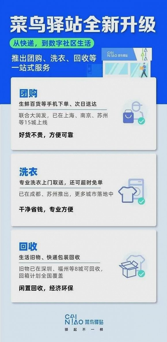 团购业务上,菜鸟驿站联合大润发,提供生鲜百货等手机下单、次日送达服务,已在上海、南京、苏州等15城上线;洗衣业务上,提供专业洗衣上门取送,超时免单,已在成都、苏州推出;回收业务,主要包括生活旧物和快递包装回收,旧物在深圳、福州等8城可回收,回箱计划则覆盖全国。