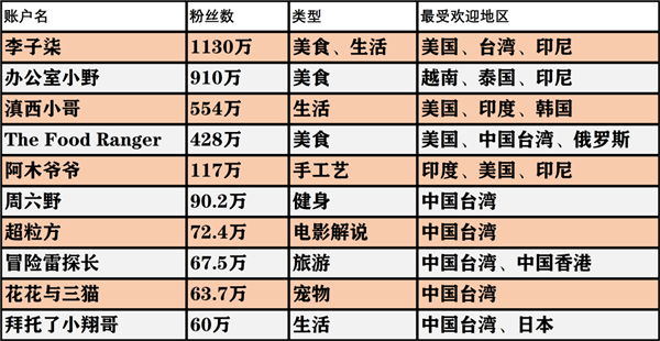 另外,排名靠前的创作者中,美食内容占多数,因为美食也是最直接、最能跨国界的内容类别。
