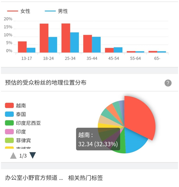 李子柒、滇西小哥有1/4左右的用户来自美国。而办公室小野的大多数用户来自越南、泰国、印尼等地区,这可能是其广告不那么“值钱”的原因。同样,我们熟悉的巫师财经、周六野、日食记等大多数受众仅在中国台湾等地。