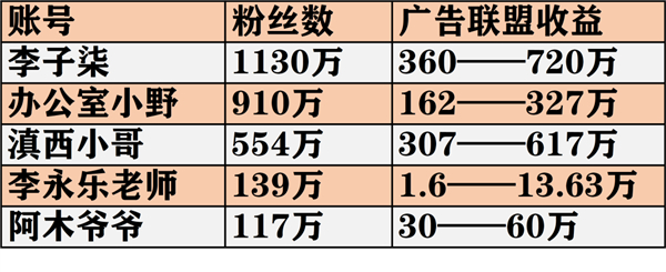 李子柒的千万粉丝每个月给她贡献的广告联盟收益仅在360-720万人民币之间,远达不到1.68亿。办公室小野的粉丝数是910万,单月广告联盟收入为162-327万之间;滇西小哥的粉丝数是554万,不到李子柒的一半,单月广告联盟却跟李子柒相当,307-617万元;有139万粉丝的李永乐老师,每月的广告收入在1.6-13.63万。