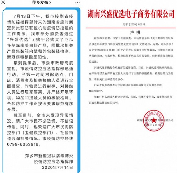 7月14日,江西省萍乡市"萍乡发布"公众号发布的一则《关于近期我市消费者购买厄瓜多尔冻南美白虾产品相关疫情防控情况的公告》称,可能有被新冠病毒污染风险的厄瓜多尔冻南美白虾产品通过兴盛优选平台流入江西萍乡,目前已开始排查。