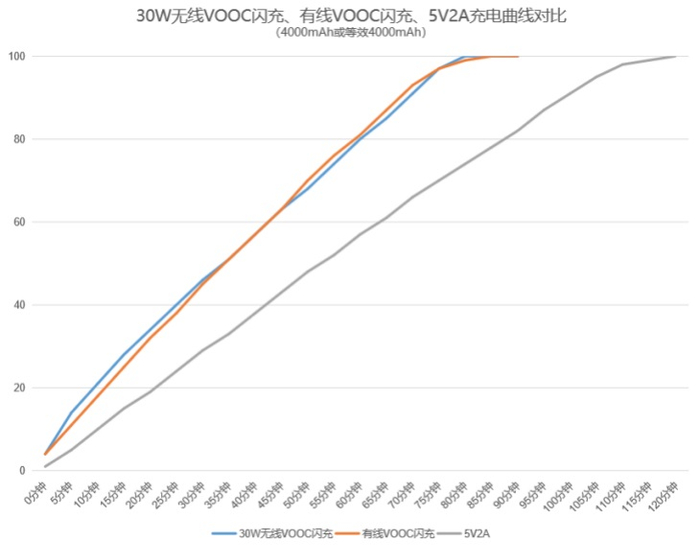 30W 无线 VOOC 闪充、有线 VOOC 闪充、5V2A 充电曲线对比(4000mAh 或等效 4000mAh)