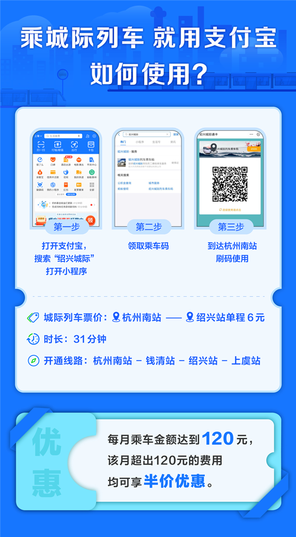 据悉,旅客只需要打开支付宝首页搜索“绍兴城际”,按照提示开通支付功能就能使用。出行当天就能直接使用支付宝刷码进站,无需提前买票,也不用带身份证,坐火车就像坐地铁一样方便。