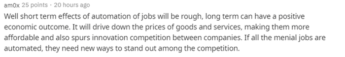 还有一位网友表示赞同,工作自动化短期内可能产生消极影响,但长期来看还是对经济发展有利的。