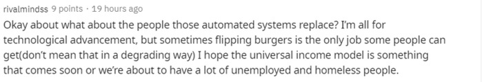 另一部分网友表示,很多人因教育机会和程度有限,只能从事一些基础工作,机器人的出现已经导致很多人失业和无家可归,希望社会能够改变全民收入模式,缓解这部分人的生存压力。