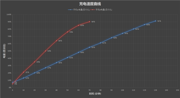 纸面上看,快充相较于10W充电普遍有着2倍以上的提升,而从实际结果来看,虽然由于后期功率降低而导致时间并没有缩短2倍以上,但是70分钟和130分钟的时间差距依然十分明显。