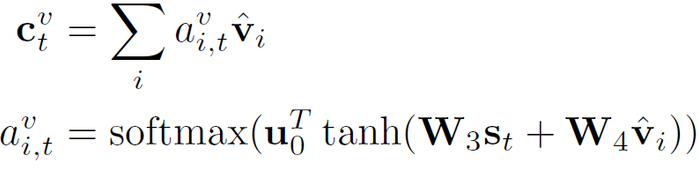 注意力图表(Attending the Graph)。在每个解码步骤 t,计算一个带有注意机制的图上下文向量 (c_t)^v:
