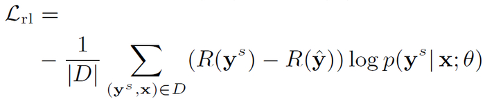 对于 RL,本文引入一种自判别策略梯度算法(a self-critical policy gradient algorithm)[8]。在训练过程中,会生成两个摘要:第一,摘要 y^s,在每个解码步骤基于概率分布 p(y^s | x;θ)抽样符号;第二,基线摘要 y^,在每个步骤中贪婪选择概率最高的符号。定义目标函数如下: