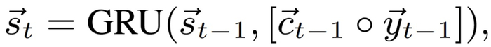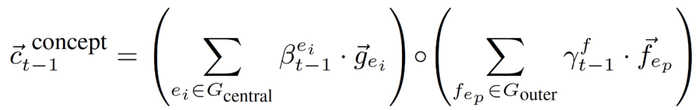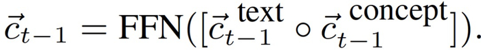 式中,y_t-1→ 是第(t-1)步生成的符号 y_t-1 的嵌入,上下文表示 c_t-1→ 连接基于文本的表示 c_(t-1)^text→ 和基于概念的表示 c_(t-1)^concept->:
