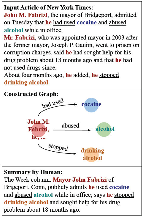 摘要生成(Abstractive Summarization)目的是产生简洁、信息丰富的摘要,从而促进有效的信息消费和知识获取。针对单文档摘要生成任务,基于序列对序列的神经网络模型取得了很好的效果。然而,由于模型结构和基于词预测的学习目标的局限性,这些模型往往产生不真实的内容和过于精练的摘要。这些情况表明,现有的模型缺乏对输入的语义解释,而对语义的正确理解对于摘要生成任务来说是至关重要的。本文作者认为,摘要的信息性和简洁性的生成需要结构化的表示,以便于实现相关主题之间的联系,并保持有全局上下文信息,如实体交互和主题流。以图 1 为示例,与同一实体相关的复杂事件可能跨越多个句子,这使得现有的序列模型难以捕捉这些信息。相反,图表示能够产生一个结构化的摘要,并突出了相关概念的近似性。