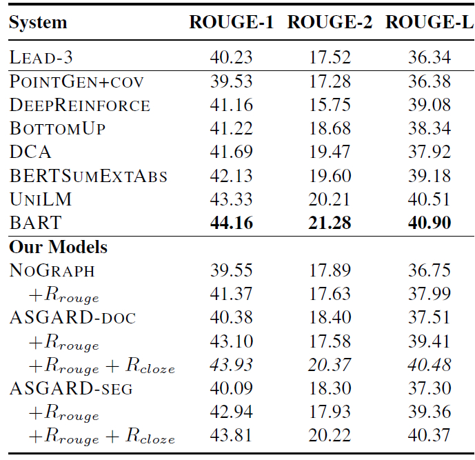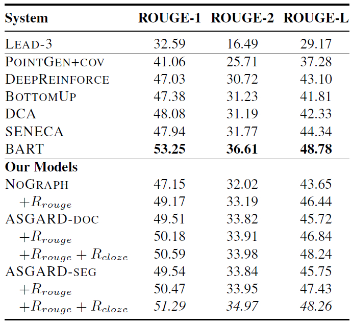 本文实验采用两个包含多个句子的摘要数据集:纽约时报注释语料库(NYT)和 CNN / 每日邮报数据集(CNN/DM)。本文提出的方法与不同基线方法的实验对比结果分别见表 1(NYT 库)和表 2(CNN/DM 库)。对于本文所提出的方法,除了使用 ML 目标训练的 ASGARD-DOC 和 ASGARDSEG 外,表 1 和表 2 的实验中还给出了用 ROUGE 作为奖励(R_rouge)和使用一个额外的完形填空奖励(R_cloze)训练的结果。最后,还给出了一个消除图编码器的变体方法 NOGRAPH 的实验结果。