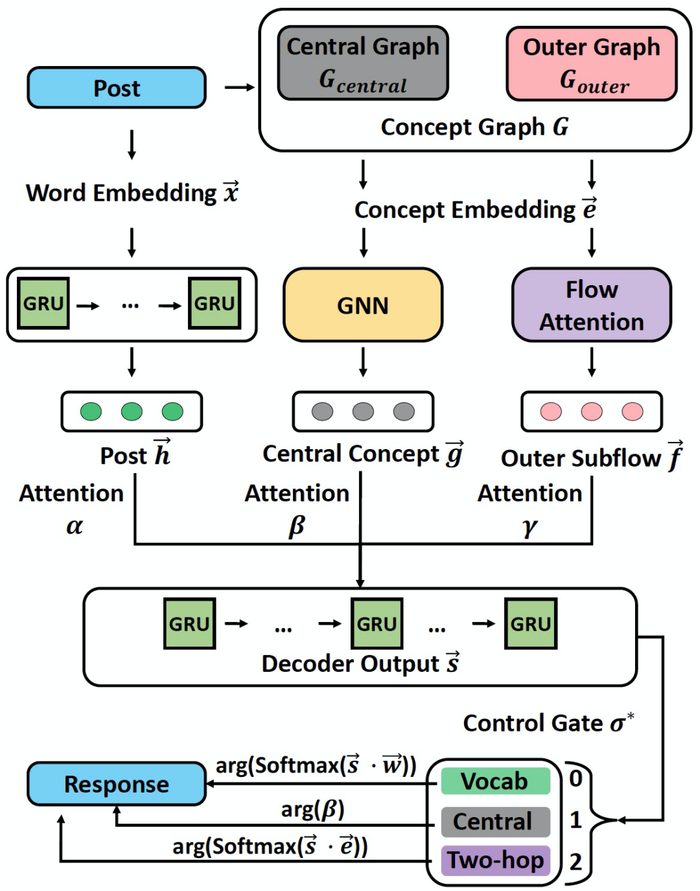 构造的概念图提供了关于概念如何与常识知识相关的明确语义。ConceptFlow 利用它来建模对话并指导生成回答。它从用户发布开始,经过中心图 G_central 和外部图 G_outer。这一步骤是通过根据用户话语对中心和外部 ConceptFlow 进行编码来实现的。