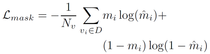其中,u_2 为训练参数。在训练期间,如果在参考引用的摘要中包含该节点的至少一个内容词,则该节点的标准掩码 m_i 设置为 1,否则为 0。对数据库 D 中的全部节点都增加下面的目标函数: