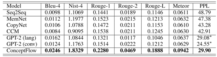 作者使用不同指标从相关性、多样性和新颖性三个方面对生成的对话的回答质量进行评价。表 1 和表 2 给出实验结果。在表 1 中,所有评估指标都用于计算生成的回答和标准回答之间的相关性。ConceptFlow 优于所有基线模型。ConceptFlow 生成的回答更具主题相关性,与基本事实回答更吻合。表 2 中 Dist-1、Dist-2 和 ENT-4 用于衡量所生成回答的多样性,其余指标则是通过将生成的回答与用户的话语进行比较来衡量其新颖性。ConceptFlow 所生成的回答在新颖性和多样性方面都获得了较好的效果。GPT-2 生成的回答更具有多样性,这可能是由它在解码过程中的采样机制所导致的。但是,与 ConceptFlow 相比,GPT-2 生成的回答的新颖性和主题相关性要差一些。
