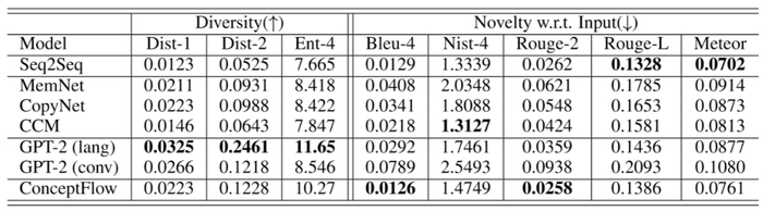 表 2. 所生成的回答的多样性(越高越好)和新颖性(越低越好)。根据生成的回答中计算多样性;新颖性则是将生成的回答与输入的内容进行比较。