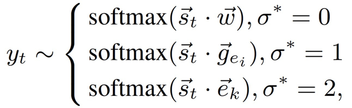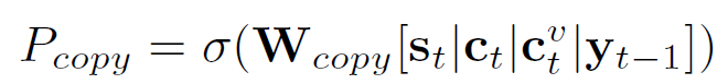 通过使用输入嵌入矩阵和矩阵 W_out 之间的权重共享,以允许复用语言知识。进一步,添加了一个复制机制,计算复制概率为: