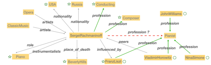 本文重点关注的就是知识图谱中的链接预测问题。1-to-N、N-to-1 和 N-to-N 的链接预测是目前知识图谱链接预测中的主要难点。以图 1 中所示为例,关系「profession」展示了一个 N-to-N 的例子,该示例中重点关注的边被突出显示为绿色。假设三元组(SergeiRachmaninoff, Profession, Pianist)是未知的。链接预测模型以「SergeiRachmaninoff」和关系「Profession」为基础,对知识图谱中的所有实体进行排序,对 「Pianist」(「钢琴家」)进行预测。实体「SergeiRachmaninoff」通过关系「profession」连接到多个作为头实体的实体,而作为尾部实体的「Pianist」也通过关系 「profession」到达多个实体。从单个实体 - 关系对出发,会出现映射到多个不同的实体的情况,这使得 N-to-N 预测变得非常困难。同样的问题也发生在 1-to-N 和 N-to-1 的预测中。