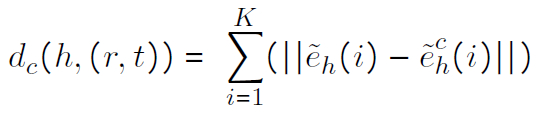 其中,e_t 为 t 的嵌入,f(h’, r’)为利用公式(2)计算得到的表示。当 N_g(t)为空时,在式(6)中引入 e_t,从而保证上下文表示的计算成为可能。这可以看作是上下文表示计算的一种加性平滑。然后,计算 t 的头相关上下文和相应的基于正交变换的三元组表示的距离,如下所示: