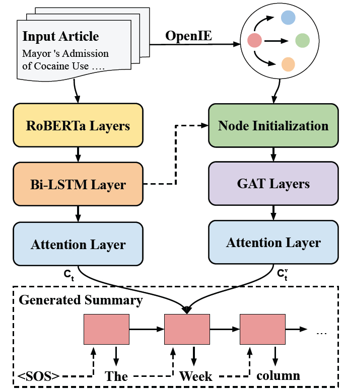图 2. ASGARD 框架。通过同时关注图谱和输入文档生成摘要。