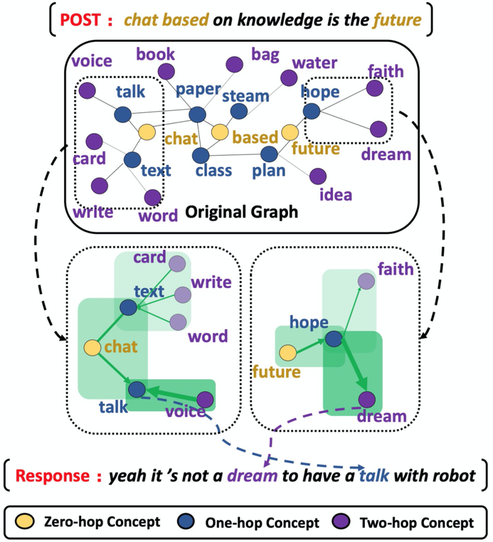 本文提出了概念流(Conversation Generation with Concept Flow,ConceptFlow),它利用常识知识图谱在显式概念空间中对会话流进行建模。例如,如图 1 所示,Reddit 的对话概念从聊天(chat)和未来(future)转移到相邻的概念——对话(talk),还沿着常识关系跳跃到遥远的概念——梦(dream),这是自然对话中的一种非常典型的情况。为了更好地捕捉这种对话结构,ConceptFlow 明确地将会话建模为常识知识图谱中的遍历:它从基础概念(如聊天(chat)和未来(future))开始,并通过沿着常识关系跳转到相关概念(如谈话(talk)和梦想(dream)),从而生成更有意义的对话。概念图中的遍历由 ConceptFlow 的图注意机制引导,通过图神经网络学习,利用会话话语、连接的概念以及它们之间的关系来关注更合适的概念。因此,模型学习在常识知识图中沿着更有意义的关系来建模会话发展。因此,ConceptFlow 学会了通过从会话话语、常识关系跳到更遥远但仍然有意义的概念,来「扩大」基础概念——这将引导生成器能够生成包含更多信息性和更具主题相关性的回答。
