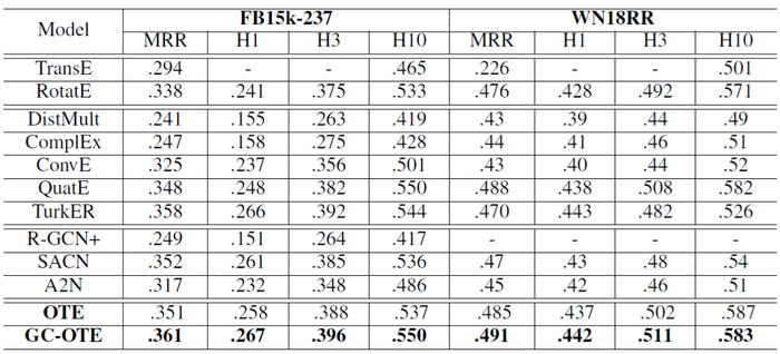表 1. FB15k-237 和 WN18RR 实验集中的链接预测性能