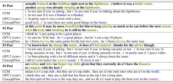 表 3 列出了从三种对话模型生成的一些回答实例。其中,CCM 生成的回答可能会不断重复相同的内容,因为它没有在概念空间中显式地建模遍历。例如,第一个和第三个案例的回答总是重复「我不确定」。GPT-2 能够生成更为流利和顺畅的回答。然而,表 3 中一些 GPT-2 生成的答案案例仅仅是从给定的帖子中复制内容或概念。例如,对于第三种情况,GPT-2(conv)主要讨论概念音乐。相比之下,ConceptFlow 生成的回答比 CCM 和 GPT-2 生成的回答更流畅、更具信息量。例如,在第三种情况下,ConceptFlow 将相关的概念声音(sound)和检查(check)引入到了回答生成中,从而能够从固定的概念音乐(music)和建议(advice)中跳脱出来。引入这些多跳概念有效地提高了所生成回答的信息主题相关性和多样性。