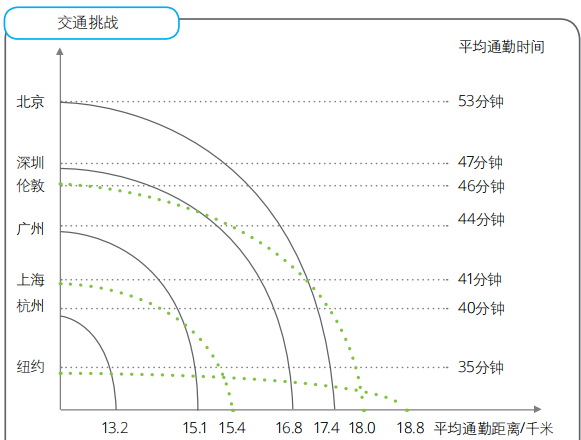 • 大城市平均通勤时间在 30 分钟以上,北上广平均通勤距离在 15km 以上。