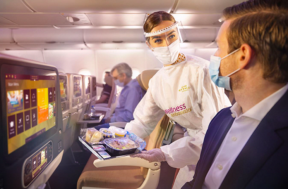 此外,为充分保障乘客与机组人员的健康安全出行,阿联酋航空实施了覆盖乘客整个旅程的安全措施,在空中和地面全方位守护乘客和员工的安全与健康。包括在登机手续办理柜台配备了抗菌防护屏、贵宾室提供无接触式菜单,并进行点餐、保持座位区的社交距离、向所有乘客发放免费的健康包等。