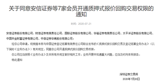 7月21日,深交所同意包括安信证券、财信证券、国联证券、华福证券、太平洋证券、中金财富证券、中信证券华南股份有限公司在内的7家公司开通质押式报价回购交易权限。