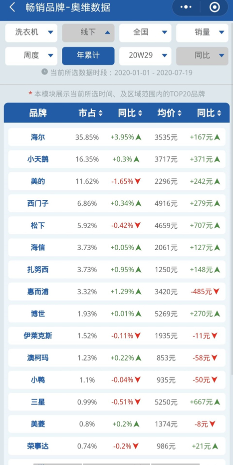 在产品均价方面,美菱洗衣机的均价只有1374元,低于2019年行业1851元的产品均价,和海尔3535元、小天鹅3717元相比更是相差很远,甚至在top20品牌中也处于靠后的位置。