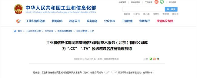 顶级域名.CC、.TV获工信部许可 可正式在中国注册备案