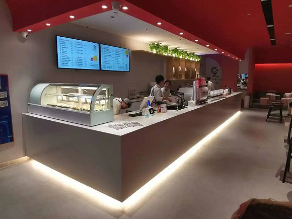 此外,饮品店吧台除了点单,还有产品操作展示的作用。早九点咖啡用了白色石英石,干净简洁,突出产品和操作。