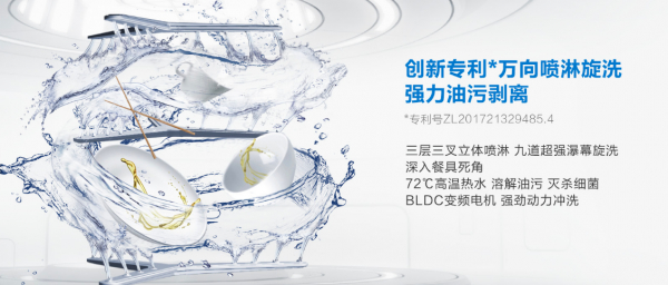 针对中式饮食重油重盐、餐具难以清洁的特点,老板强力洗洗碗机W735内置搭载变频电机的强力洗净系统,专利三叉立体喷淋系统通过46道72℃高温水柱集中冲刷和20个喷淋角度环幕喷淋,360°旋喷劲洗重油重物餐具,不仅能在快速溶解油污的同时利用高温灭除细菌,还能深入各种餐具的死角,带来全方位洁净,解决了过往用户对于“洗碗机能否洗净”的疑问。